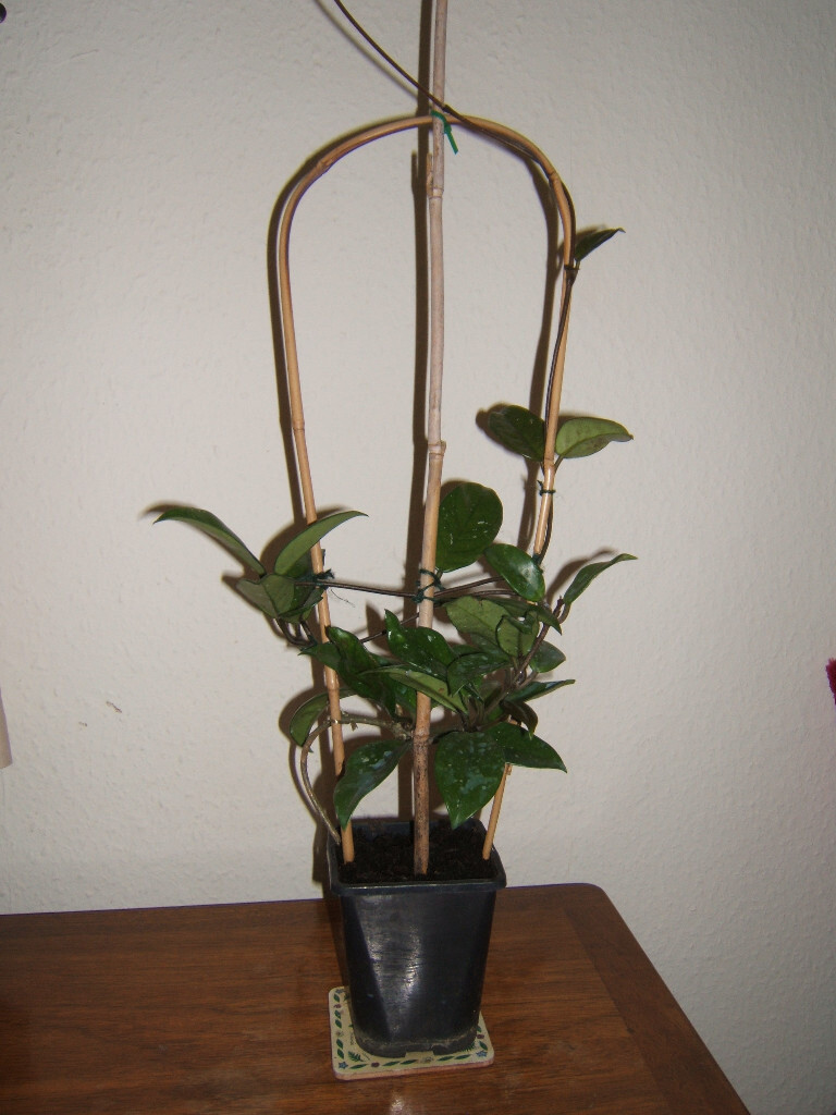 Hoya carnosa is a strong growing climber and should be grown up a trellis or around a wire hoop. We propagate hoyas from our own hoyas at our home. This plant which is currently trained up a small trellis is an excellent trailing plant which likes high humidity.
